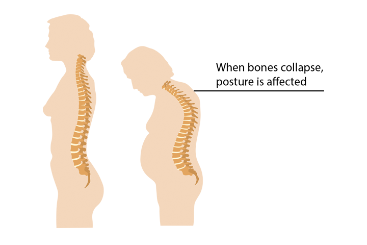 Osteoporosis is a disease that affects the inside of your bones, making them fragile. The images above show how Osteoporosis causes large holes to develop in the inside of your bones, which is why they break easily. Broken bones are also known as fractures. Example: You have been told that you have fractured vertebrae/ collapsed vertebrae/crushed vertebrae, which all mean you have broken bones in your back.